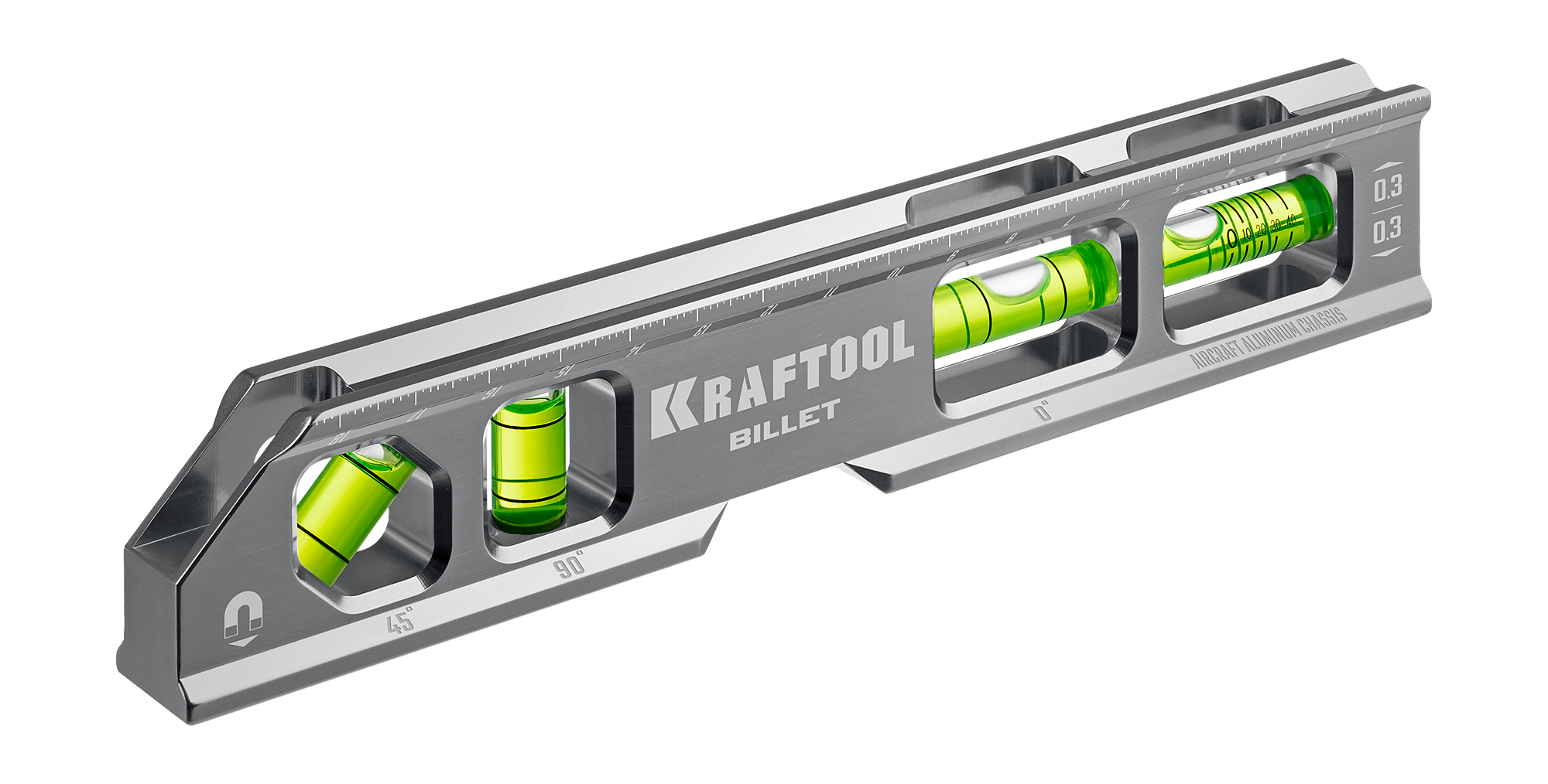 Точное изготовление рамы на станке с ЧПУ возможность измерения со всех четырех сторон8 измерений в одном: 0%, 1%, 2%, 3%, 4%, 0°, 45°, 90°4 высокоточных глазка, изготовленные в Японии, с гарантией 100 летИсключительная точность 0.3 мм/м с четырех сторон3 сильных редкоземельных магнитаВыемка для сварного шва или фальцаV-образный вырез для установки на трубыИзготовлен из Особо прочного авиационного алюминияКорпус оснащен специальным скосом 45° с окном для фронтального измерения